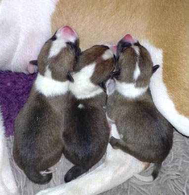 Jenna födde igår kväll tre perfekta valpar (trillingar, lika osm bär, kopior, kloner) snabbt och enkelt och hon är en fantastisk mamma som mår bra och är stolt över sina småttingar.